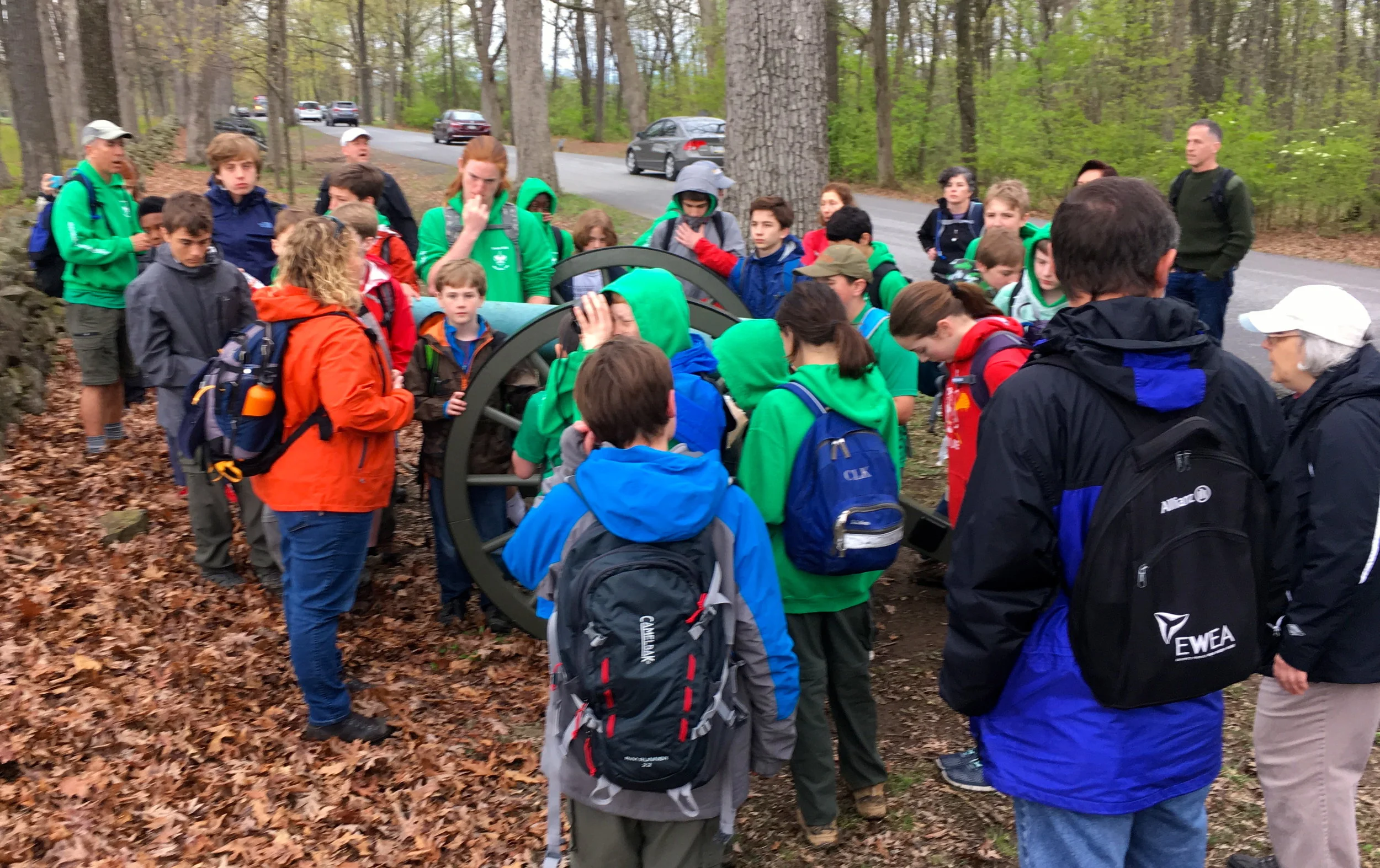 25 scouts, a scattering of sisters, a lone webelos and a happy group of parents endured the rain to be lead around the battlefield by a great guide. She was truly passionate about the battle and really tried to get the boys to understand the true gravity of what happened. I think she succeeded.